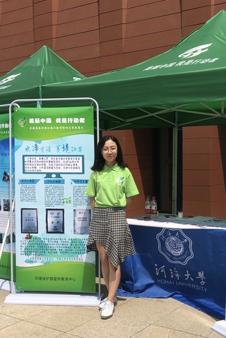 在大二学年,她担任河海青协文化宣传部部长。与此同时,她从未停下志愿的脚步。在华侨慈恩托养中心,带领残障人士亲近自然,体验更丰富的室外活动;在“青春伴夕阳”的活动中,把手工制作和优秀社团的精彩节目带进社区;在小学基地,以宣扬河海水文化为出发点,以水利特色模型为中心,创新开展科普知识与体验制作完美融合的个性课堂。并在“水净生活,美境江苏”护水行动项目国赛筹备阶段,负责项目文创产品的设计与制作,为项目拿到第三届中国青年志愿服务项目大赛金奖保驾护航,贡献力量。