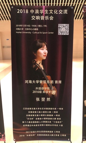 三年的努力与历练,张翌然慢慢接过乐团的接力棒,成为管弦乐团首席,从此多了一份责任,也多了一份幸福。2018中澳学生文化交流交响音乐会,通过近半年的准备,张翌然成功完成了专场音乐会的首席表演,获得了师生的一致好评。三年的时间服务河海管弦乐团,近百场演出,她为传播河海文化艺术、提升河海艺术氛围贡献出自己的力量。