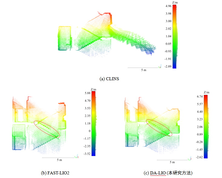 研究团队使用头盔式激光扫描系统在典型室内外场景采集了四个序列数据,与现有激光惯性里程计方法和后端优化方法进行对比验证,充分验证了DALI-SLAM方法的有效性。结果表明,该方法前端部分与基于滤波器的SOTA方法FAST-LIO2相比,轨迹的均方根误差分别减少了53.9%、35.1%和7.9%;该方法后端部分分别将轨迹误差进一步降低了25.2%、9.2%和52.4%。在序列4上三维建图对比结果见图2。