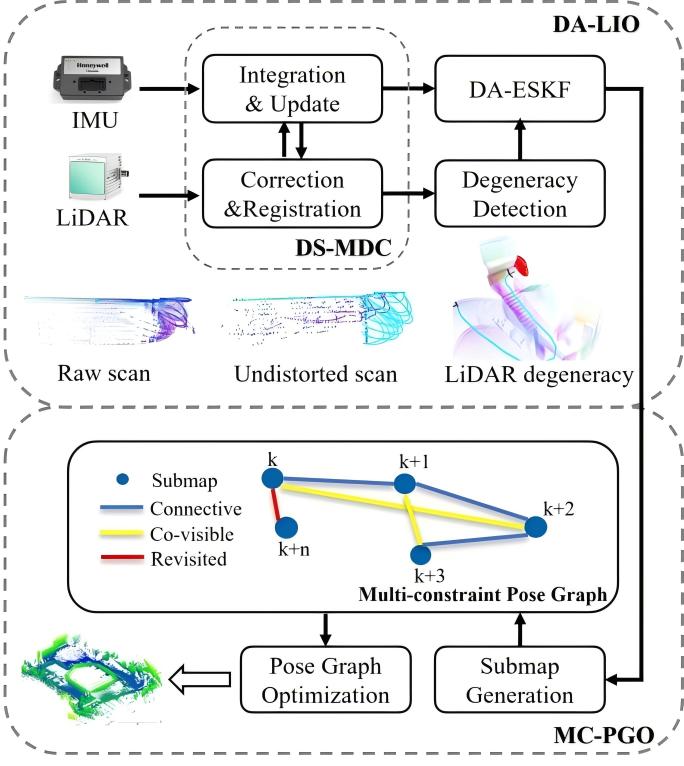 激光雷达-惯性同步定位与建图(LiDAR-Inertial Simultaneous Localization and Mapping, LI-SLAM)在机器人定位导航与低成本三维建图等应用中发挥了至关重要的作用。然而,现有LI-SLAM性能仍受限于运动畸变校正与位姿图约束不准确以及LiDAR特征退化等问题。现有的FAST-LIO2方法借助惯性测量单元(Inertial Measurement Unit, IMU)进行运动畸变校正,但IMU积分的累积误差导致越靠近帧末的激光点校正误差越大。此外,固态LiDAR(如Livox Avia)受到扫描频率低、视场角受限的影响,易发生特征退化。总之,现有方法未充分考虑激光特征退化对位姿估计的影响,导致多源数据融合位姿精度低。针对上述挑战,研究团队提出了一种精确且鲁棒的激光惯性SLAM方法DALI-SLAM(方法流程见图1)。该方法的贡献点如下: