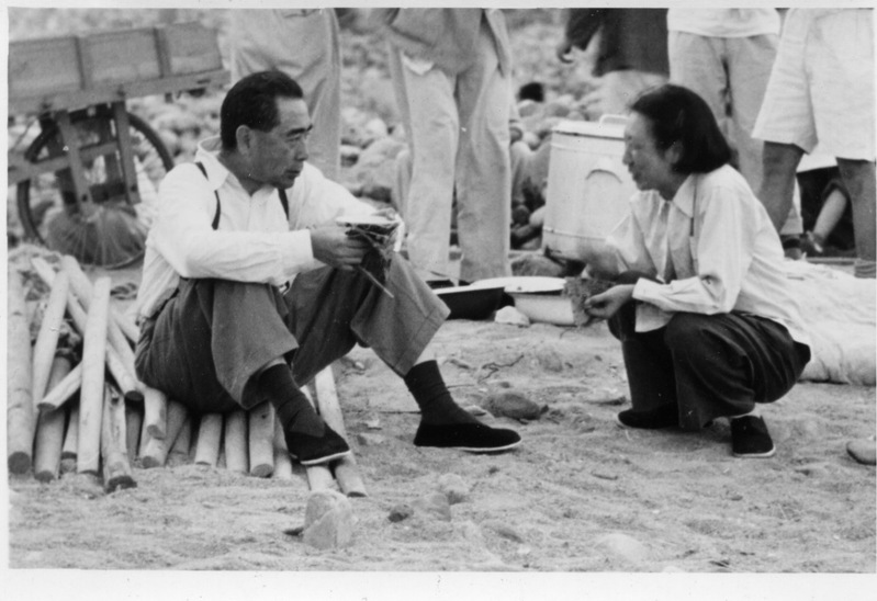1958年,周恩来总理到十三陵水库工地参加劳动,边吃饭边听取钱正英汇报。